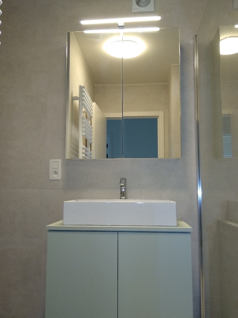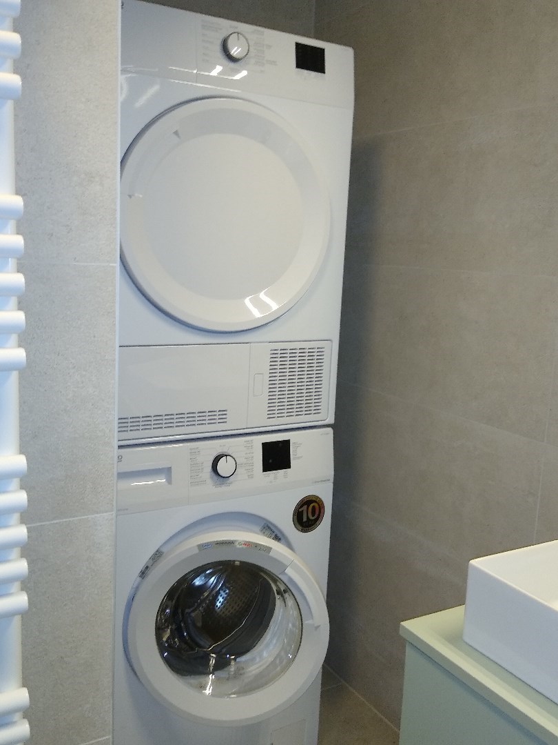 Naast de garage beschikt het appartement over een badkamer. Deze is voorzien van alle nodige faciliteiten, zoals een ruime inloopdouche en een wastafel. Een wasmachine en droogkast werden reeds voorzien. Het toilet is apart. Er is een handwasser en een ingemaakt kastje voor wc-benodigdheden in op te bergen.