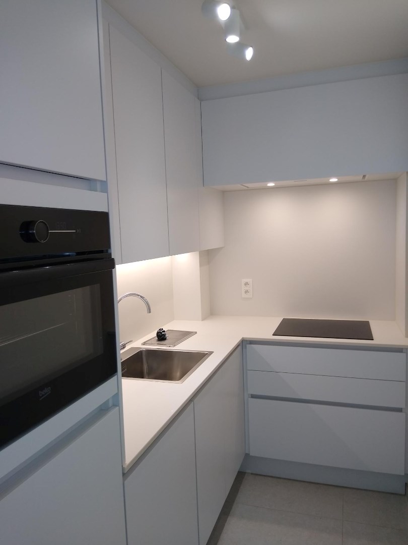 De keuken is volledig nieuw en beschikt over alle nodige toestellen (combi-oven/spoelbak/dampkap/vaatwas/frigo)