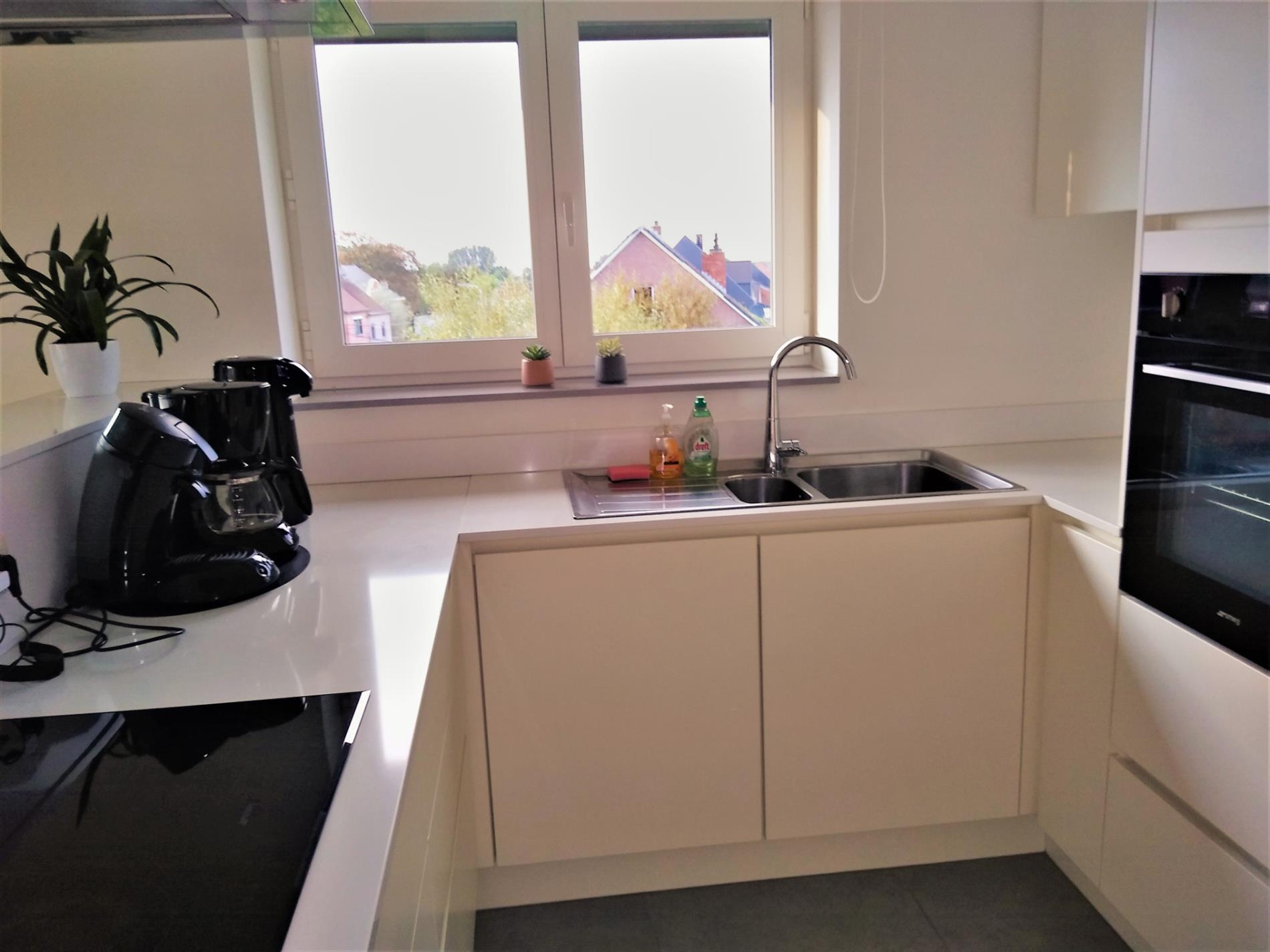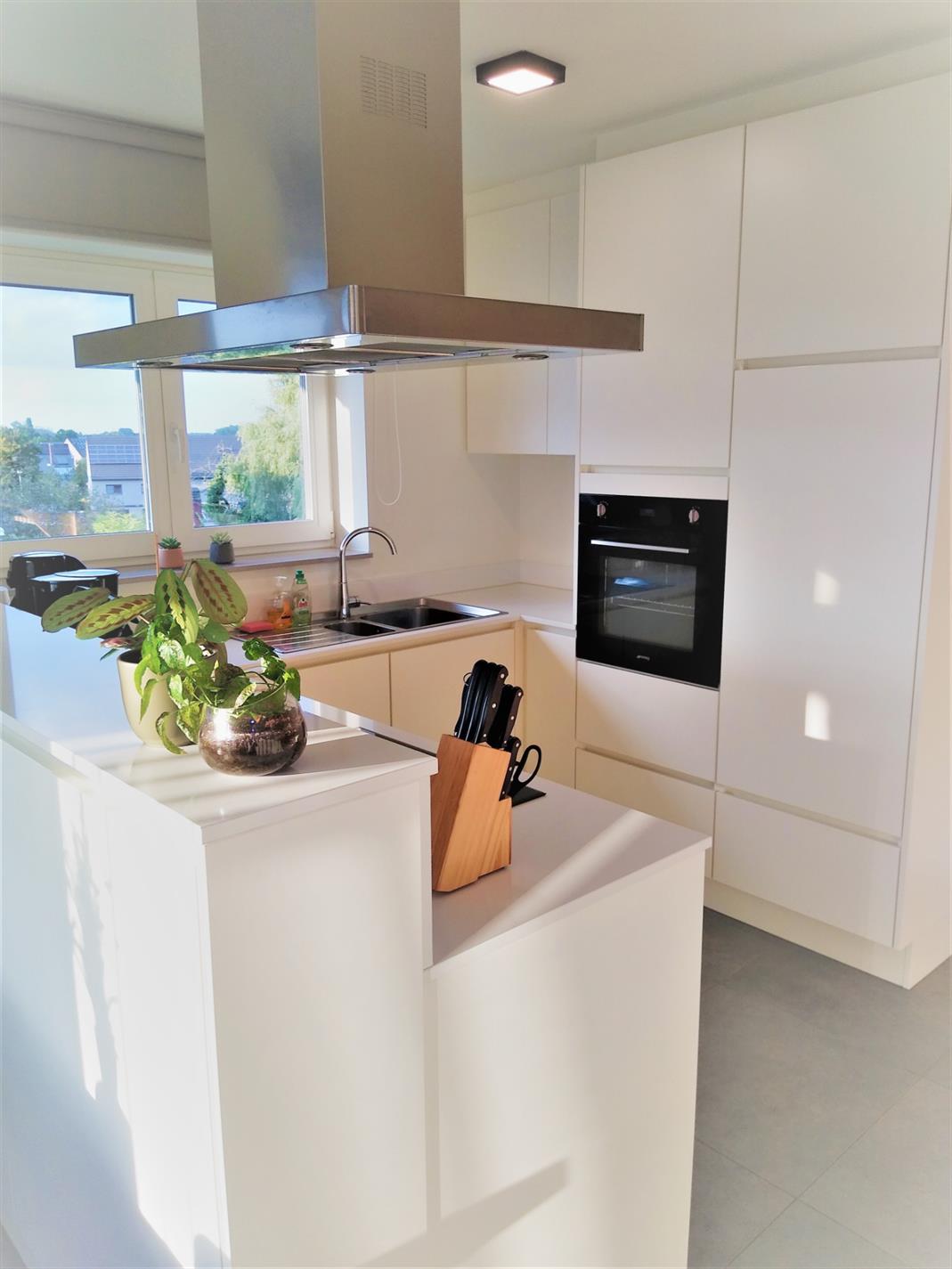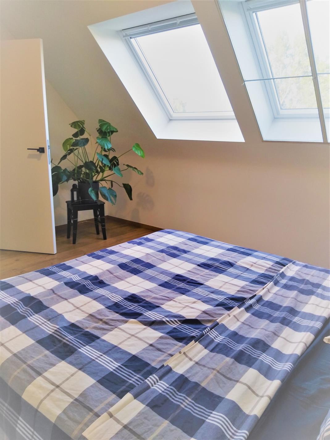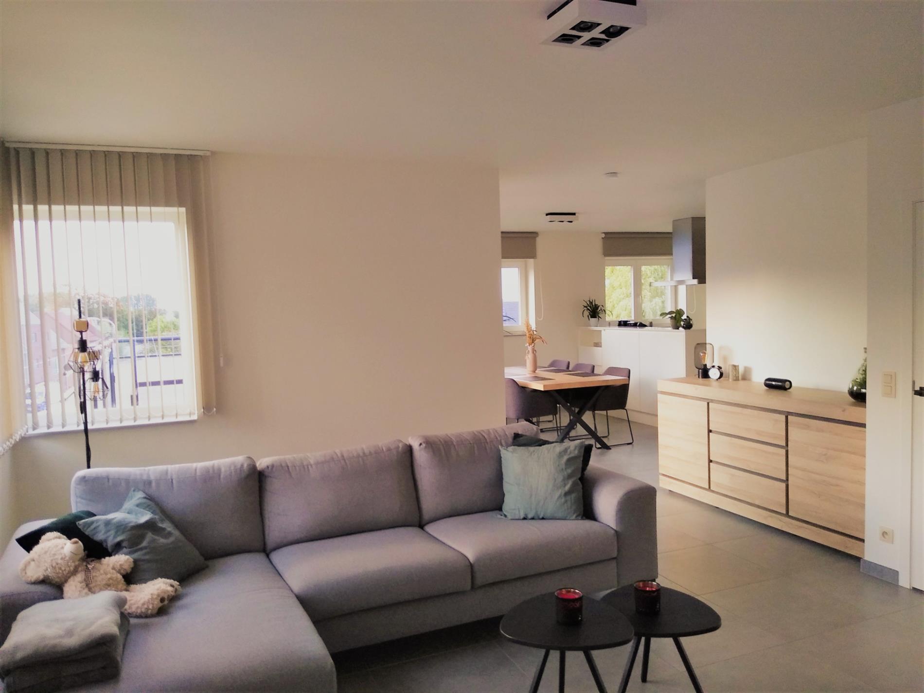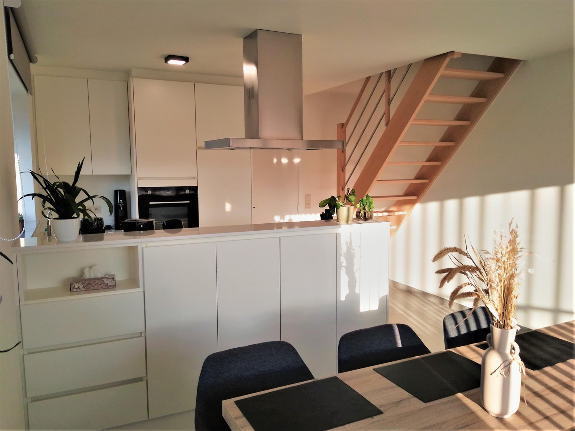 Dit recent appartement wordt verhuurd tegen 1 januari 2022. Het is een duplex-appartement op de 2de en 3de verdieping in de residentie 'Da Vinci' te Lede. Het appartement beschikt over 2 slaapkamers, waarvan één op het benedenniveau en één op de verdieping. Volledig instapklaar want reeds geschilderd, overal verlichting voorzien en zelfs lamellen en stores aan de ramen. Zeer lichtrijk dank zij de vele raampartijen. Heel grote living met aanpalende open keuken, die beschikt over een verzoet werkblad en alle comfort aan toestellen. Aanpalend treffen we de heel ruime berging, geschikt voor wasmachine en droogkast, alsook proviandruimte. Hier bevindt zich de warmtepomp via dewelke het volledige appartement wordt verwarmd via vloerverwarming. Er zijn maar liefst 4 thermostaten op het appartement. Via het schuifraam kom je op het terras afgewerkt met tegels en sterke balustrade. Via een lange gang kan je de slaapkamer op benedenniveau bereiken en bevindt zich eveneens een badkamer met heel ruime inloopdouche en dubbele wastafel, alsook een apart toilet. Via een stevige trap met open treden bereiken we de bovenste verdieping waar zich een slaapkamer bevindt met aanpalend een 2de toilet en wastafel, alsook een ingemaakte dressing. Via de lift kan je naar de ondergrondse garage gaan. deze heeft een automatische sectionaalpoort en is heel ruim. Bezichtiging enkel op afspraak op zaterdag 25/09 vanaf 11 uur via mail op info@qualimmo.be of tel. 053 80 92 70 In de huurprijs is de garage inbegrepen en ook de gemeenschappelijke lasten.