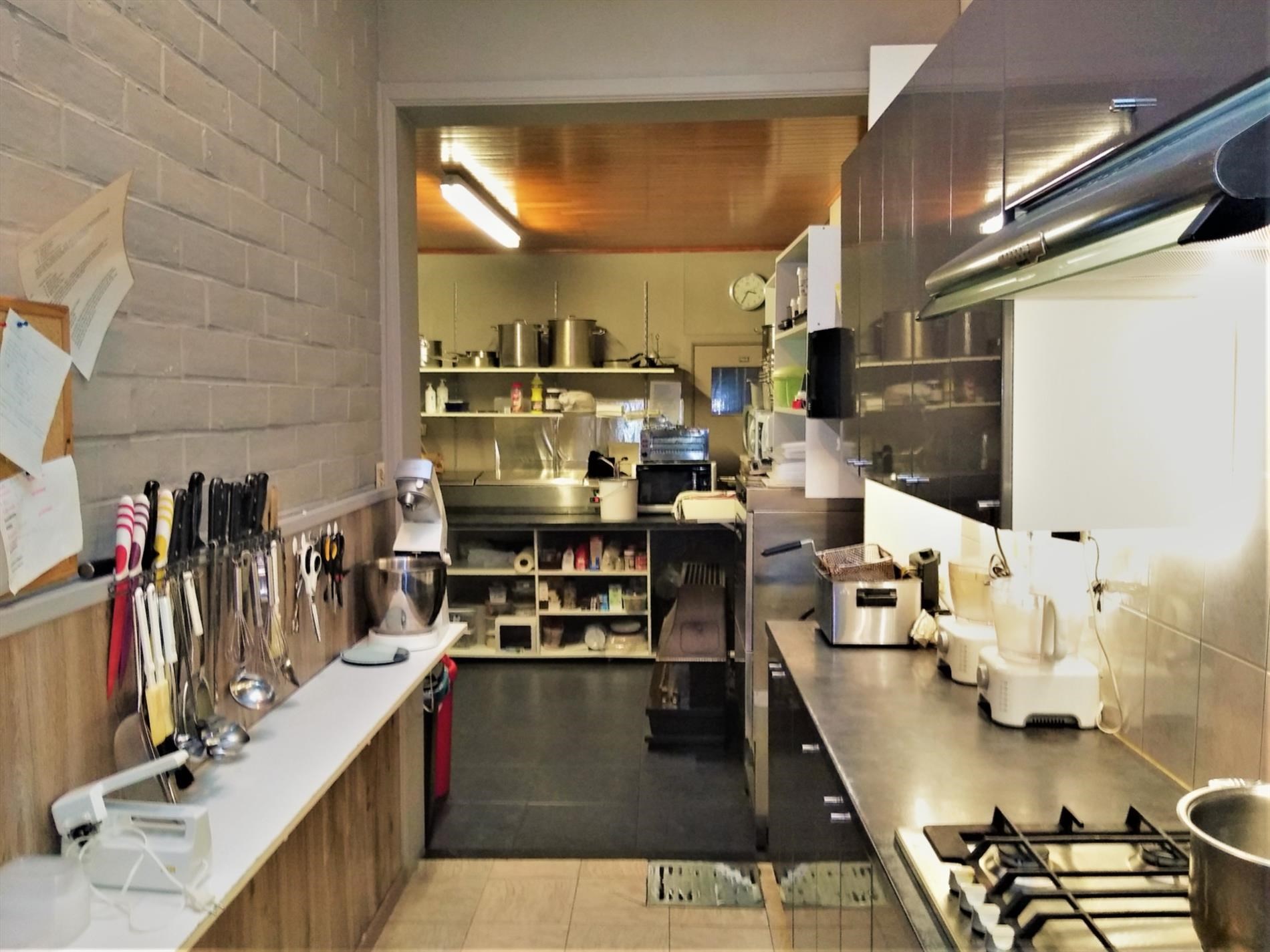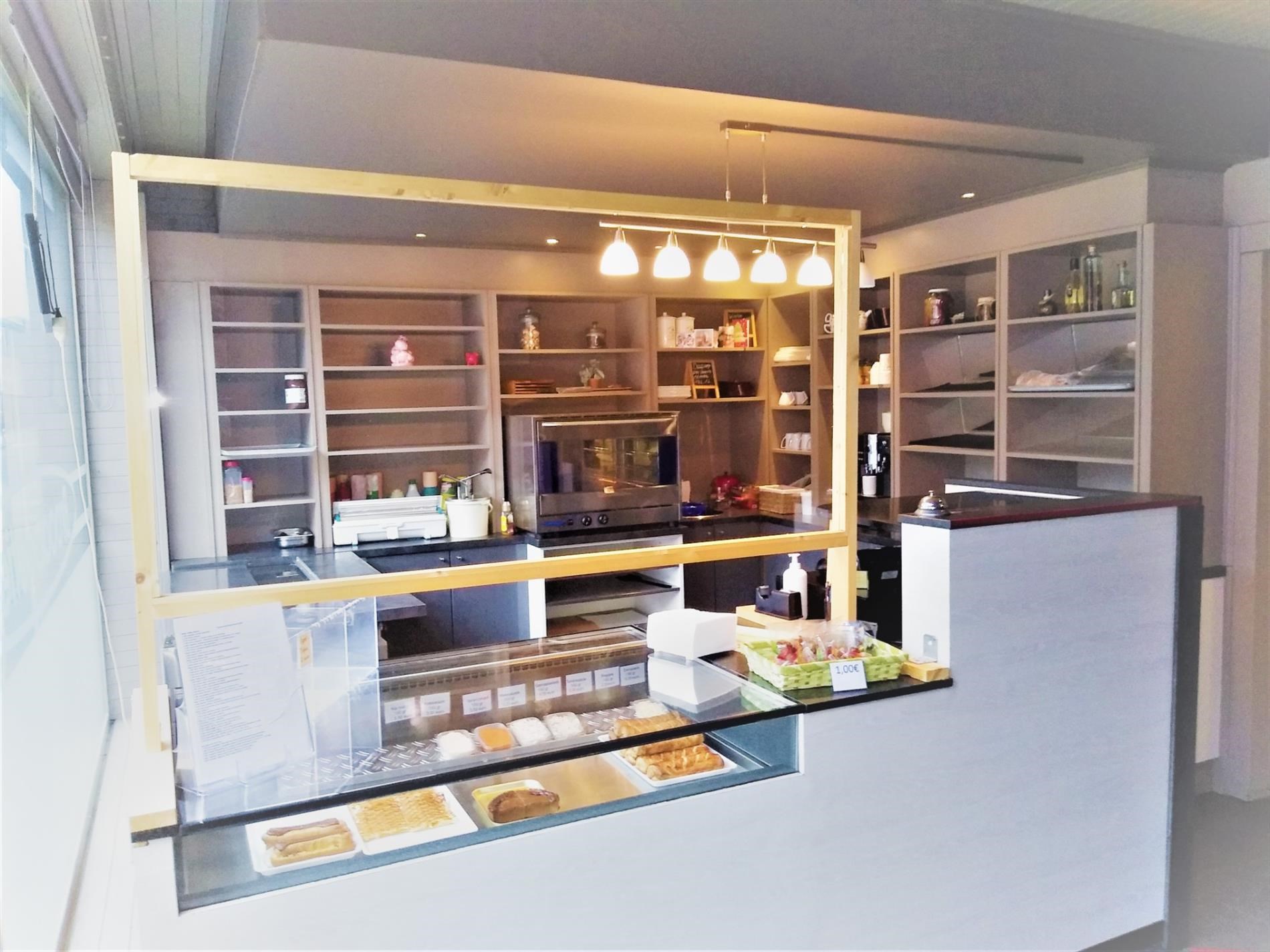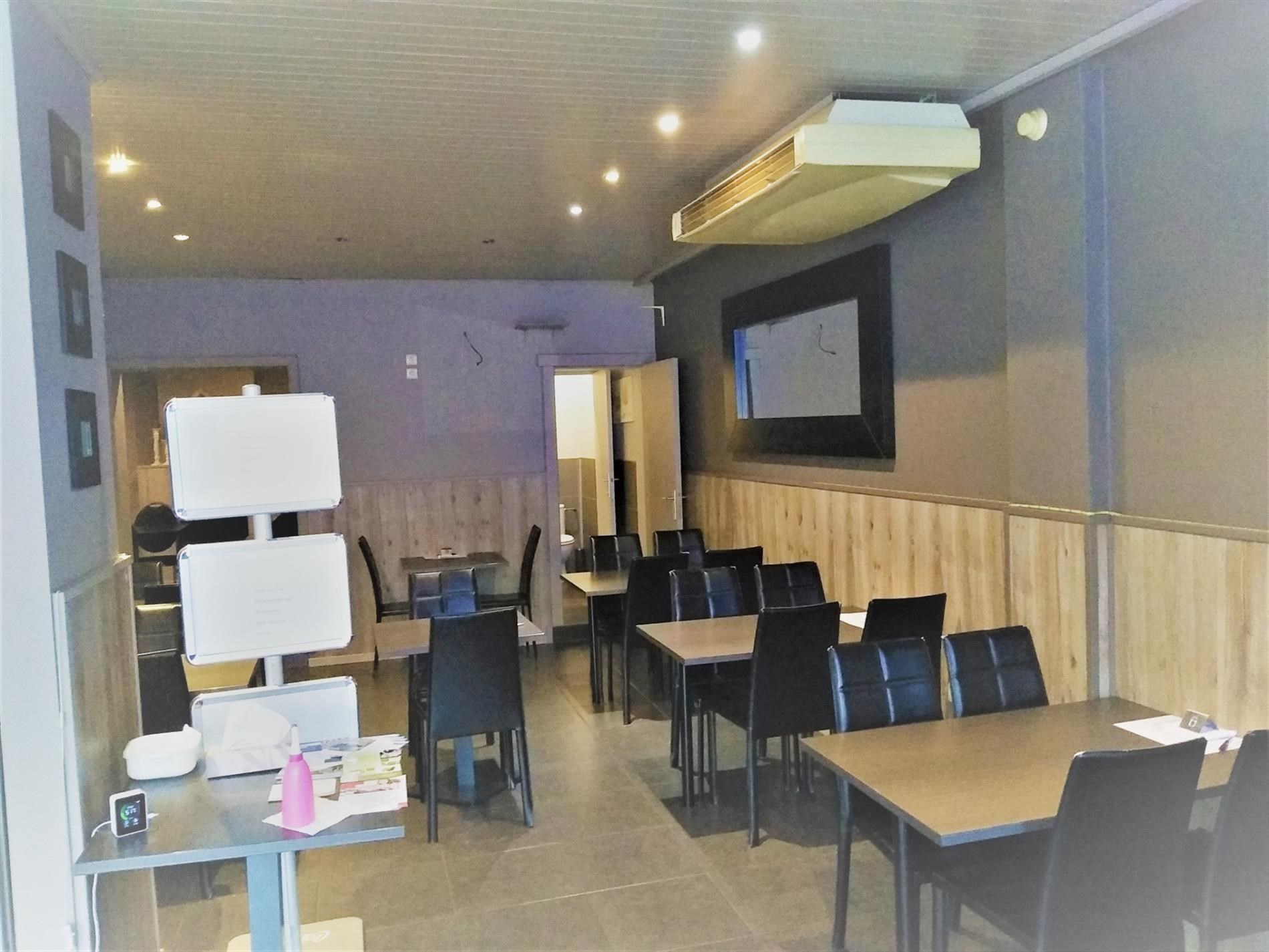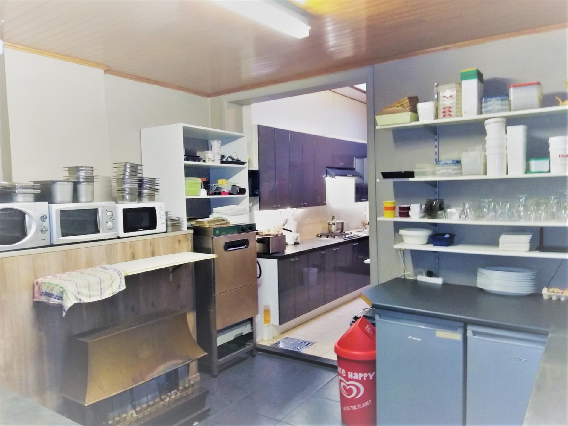 Op gelijkvloers is het handelsgedeelte dat onmiddellijk kan in gebruik genomen worden. Er zijn 2 gastentoiletten en een 30-tal zitplaatsen om ter plaatse te eten. De scholieren kennen dit gebouw zodanig dat zowel 's ochtends voor schooltijd als 's (na)middags deze plaats zeer druk bezocht wordt. Het handelsgedeelte omvat vooraan links een bedieningsgedeelte. Daarachter de keuken voor mise-en-place, alsook een uitgeruste keuken. Aanpalend een badkamer met wc. Daarachter professionele koelkasten en werkplaats. Rechts aanpalend is momenteel een slordig ogend magazijn hetwelke een zee van ruimte biedt als stockageplaats of als mogelijke uitbreidingszone voor het handelsgedeelte. Boven bevindt zich het te renoveren woongedeelte Achteraan het gebouw is een ruime garage met automatische sectionaalpoort. Deze garage is toegankelijk via een aparte weg achter het gebouw. afspraak tel. 053 80 92 70 of mail info@qualimmo.be Vastgoedinformatie "in aanvraag" Wg/Gdv/Vkr
