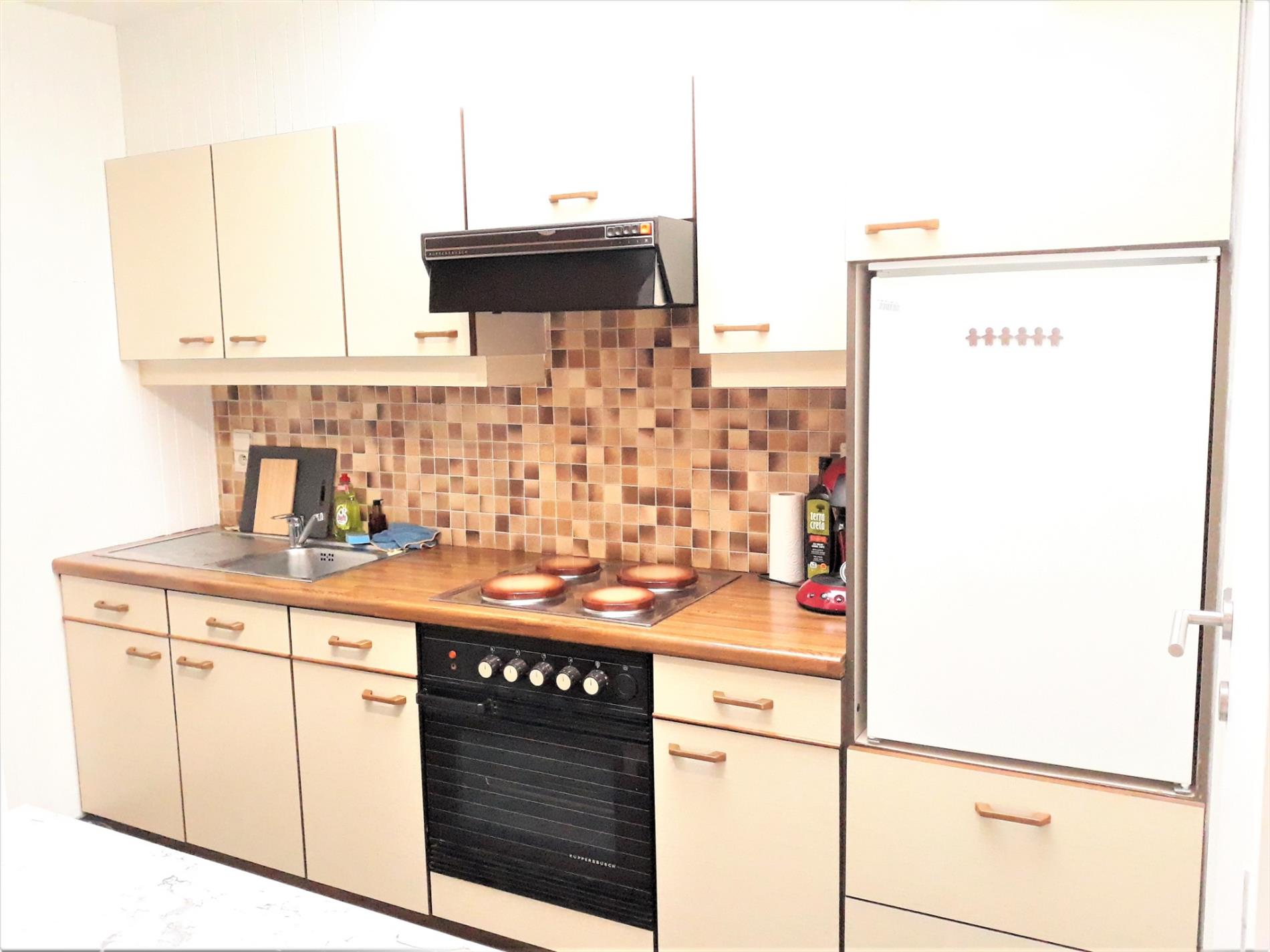 Deze grondig gerenoveerde woning op wandelafstand van station en centrum Zottegem is 100% instapklaar. De elektrische installatie voldoet helemaal aan de voorschriften. De oude verwarmingsketel die zorgde voor de hogere EPC-waarde werd vorig jaar vervangen door een geheel nieuwe verwarmingsinstallatie op aardgas. Ook de ruime badkamer die links naast de inkomgang ligt, werd helemaal aangepast aan het hedendaags comfort met douche, wastafel, bijhorende badkamermeubelen en toilet. Hierbij werden ook alle leidingen vernieuwd. Op het einde van de inkomgang vinden we de knusse woonkamer met open keuken. Deze is uitgerust met een elektrisch fornuis, oven en koelkast. Hierachter is nog een wasplaats/berging. Via de trap in de woonkamer gaan we naar beneden en komen we terecht in twee ruime kelderkamers die voor heel wat bergruimte zorgen. Nemen we de andere trap, dan komen we op de eerste verdieping met twee ruime slaapkamers. De woning heeft twee volwaardige verdiepingen met een plat dak, aluminium ramen met dubbel glas en in de woonkamer-open keuken is bovendien een koepel die geopend kan worden. Er is geen tuin.