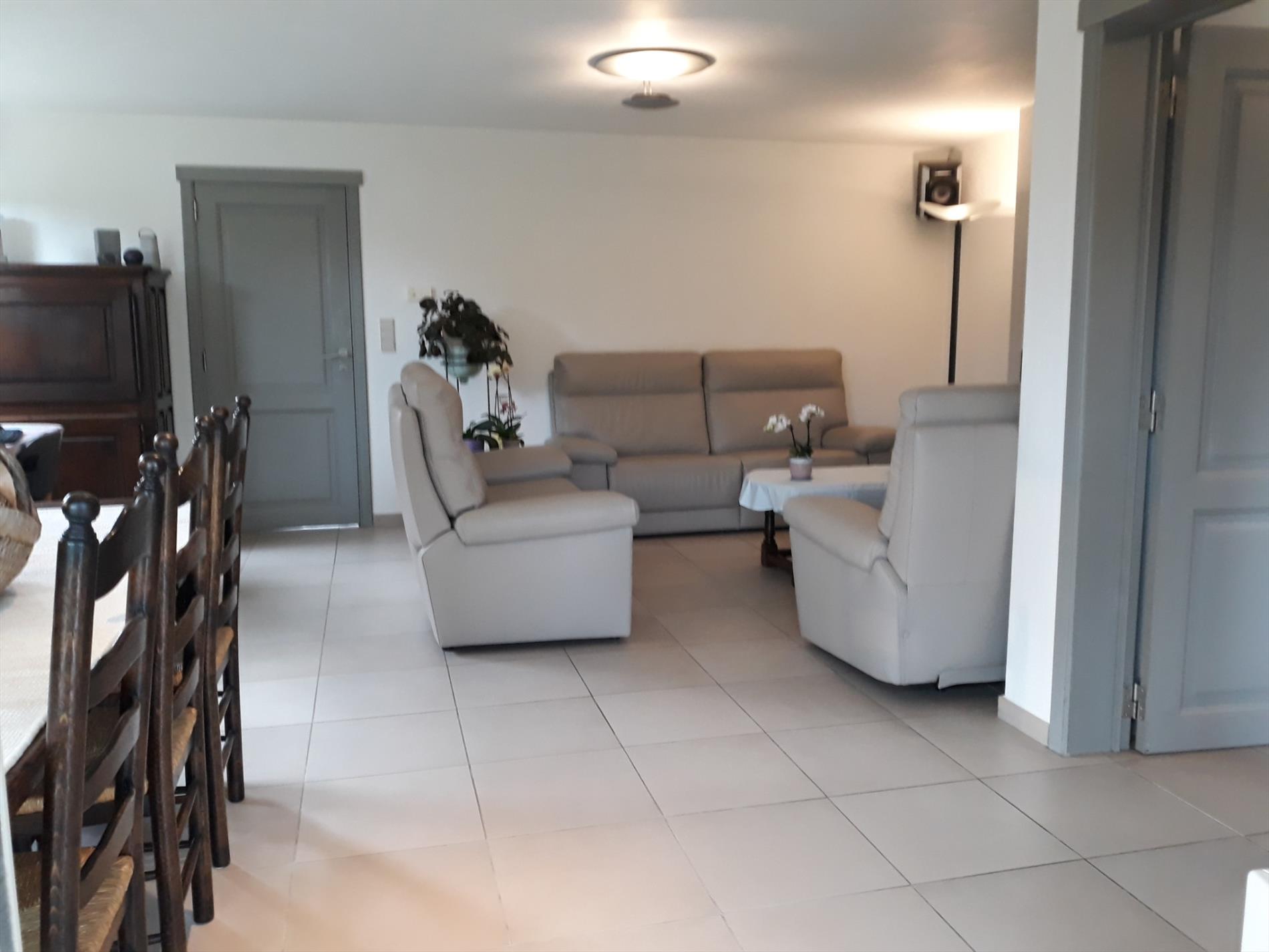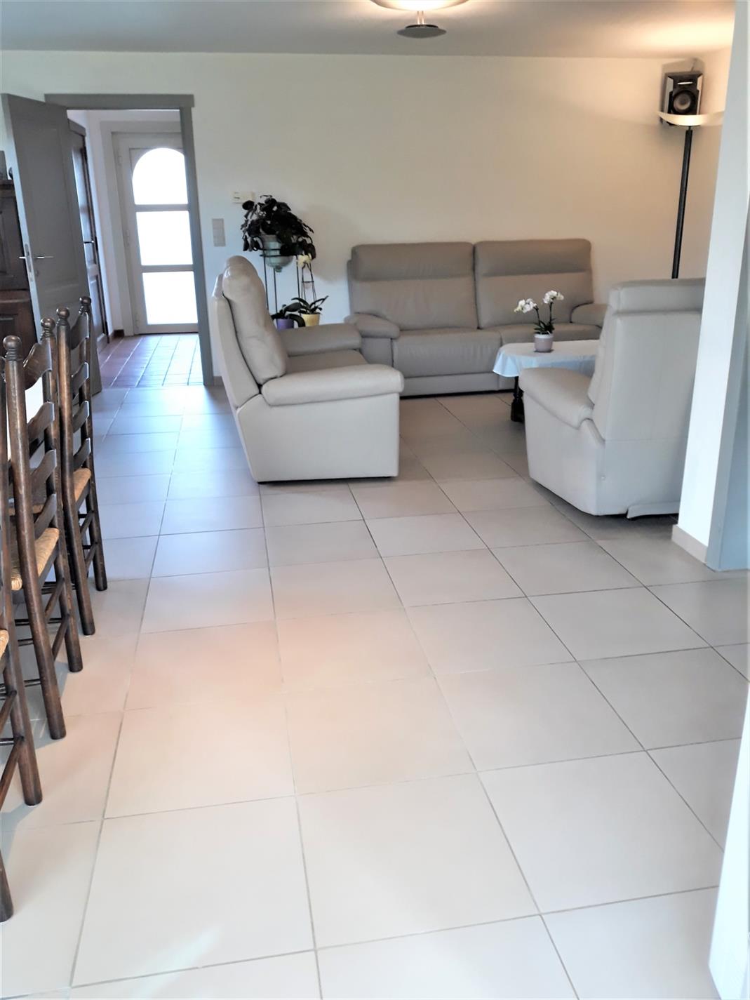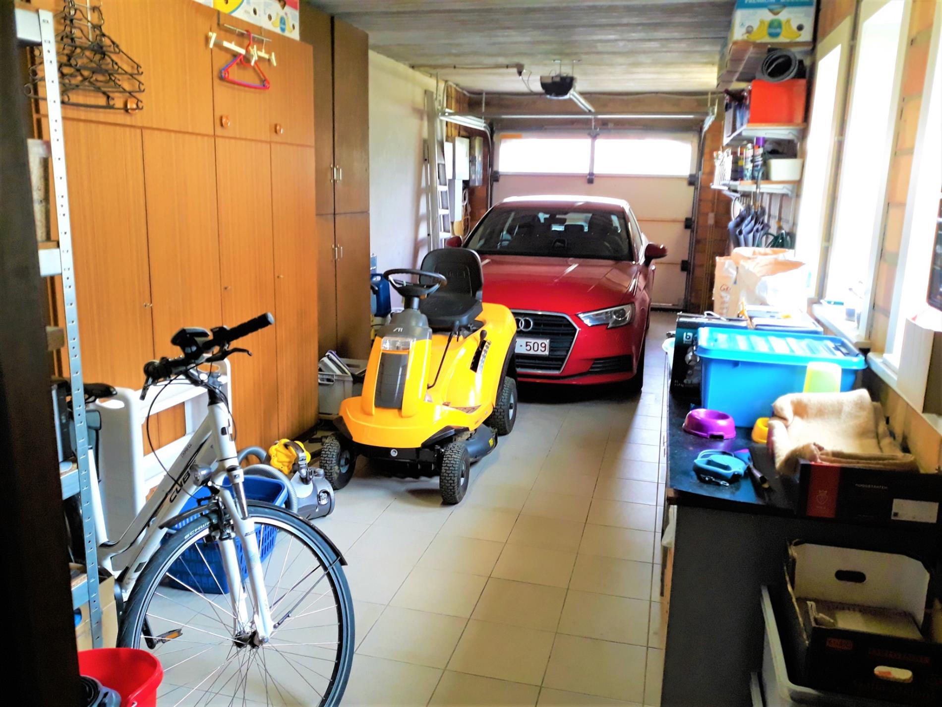 Thuiskomen doe je met een druk op de knop die de elektrisch bedienbare poort voor je opent. Zo krijg je toegang tot het volledig omheinde perceel van 15 are. Als we naar binnen gaan, vinden we op het gelijkvloers een ruime inkomhall met apart gastentoilet, een L-vormige living met inbouwkachel, een veranda, een ruime leefkeuken, een wasplaats en een garage voor 2 wagens met elektrische sectionaalpoort. De keuken geeft ook toegang tot de kelder die praktisch ingedeeld is in twee koele voorraadkamers.